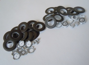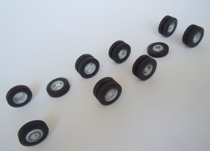 Uplynula hromada času, během kterého jsem zrobil hromadu koleček. Díry v disku jsem všechny vyřezal, celkem mne ale otrávilo konstrukční řešení kol, kdy průměr kruhu vytvořeného páskem disku je o víc než milimetr větší, než vnitřní průměr bočnice kola. Dírami je tak vidět přesah, který ani po zabarvení nevypadá hezky. Jak jsem psal dříve, prý je to tak schválně kvůli vzhledu. No, nevím.. Mně to po vložení prořezaných disků pěkně naštvalo. Příště musím u kol RW počítat s tím, že ten pásek je potřeba trošku zkrátit.