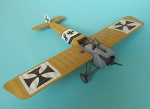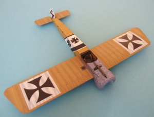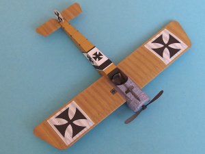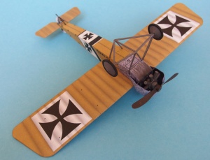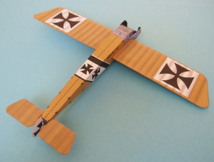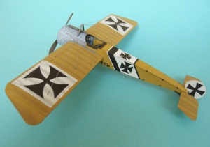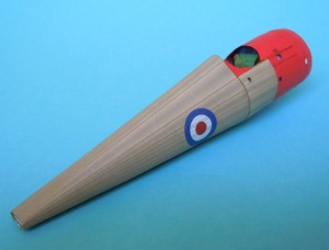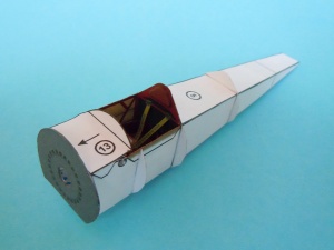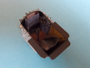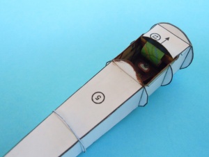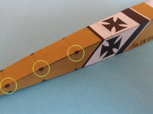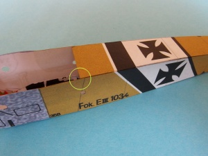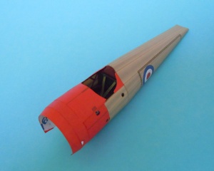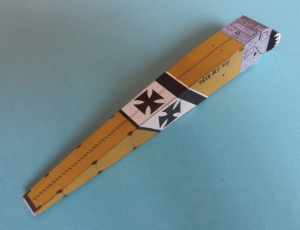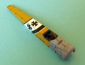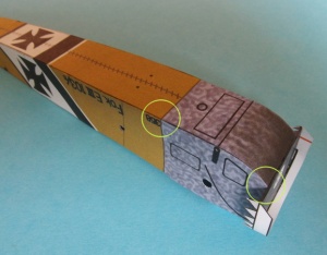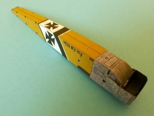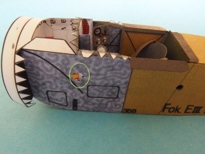 Odchýlil jsem se od návodu a příď jsem zpracoval celou. Vnitřek jsem nabarvil, resp. vylepil barevným papírem. To konstrukci i zpevnilo, což tomu ábíčkovskému papíru jen prospěje. Plát před kokpitem (díl 31) jsem musel na každé straně zúžit téměř o milimetr.