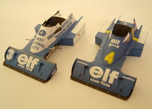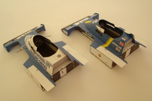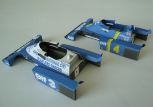 Pokračuji ve stavbě. U zvýšených bočnic jsem chvilku tápal, na kterou z rysek se mají lepit. U postavených modelů je to k vidění tak půl na půl, předloze však podle mne víc odpovídá vodorovná horní plocha. Vedle nyní prezentovaného mám rozpracované další menší celky a pod zátěží schnou díly předních náprav a zadního křídla. Na GP HB bych to tedy měl stihnout.