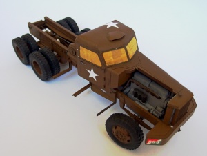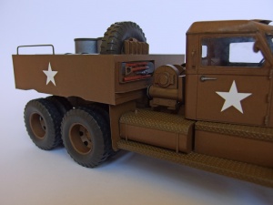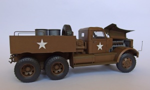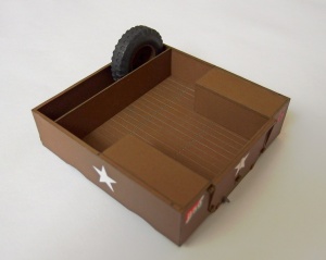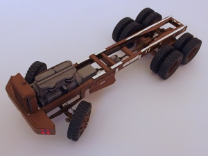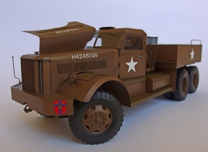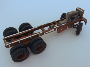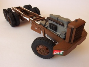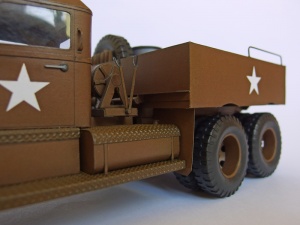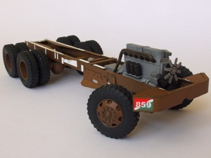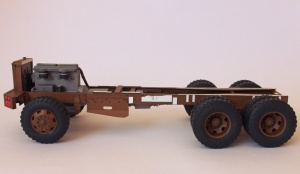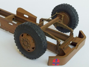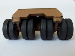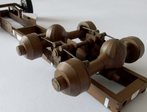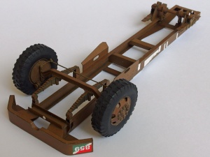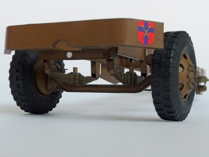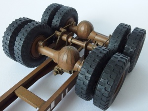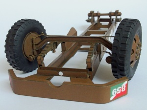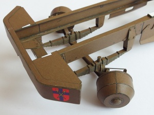 Přední nápravu má model koncipovanou pevnou, ale není problém ji udělat řiditelnou. Z nepřesností mám tentokrát poznačenou jen šablonu dílu 18C, měl by být delší. Zradou modelu je, že barva není moc kvalitní. Již na začátku jsem zmiňoval černou, která se mírně otírá při častější běžné manipulaci. Barva khaki se zase ochotně sedře byť jen při posunu modelu po papíru, takže se snažím do nejdříve dostat model na kola.