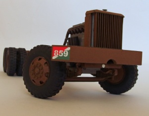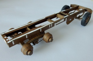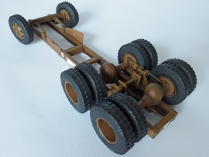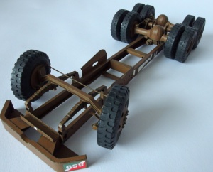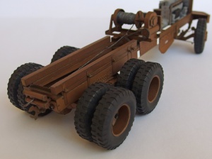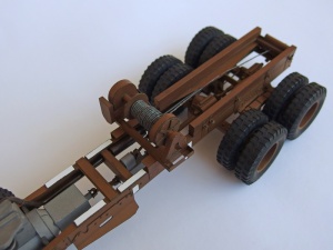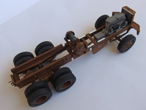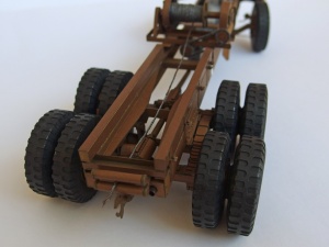 Tahač mi začíná dělat radost. Podařilo se mi ho už dostat na všechna kola, a další práce tak bude zábavnější. Bez zádrhelů se to ale opět neobešlo. Díl 45 (základ zadních náprav) má nesmyslně vyznačeno podlepení, kvůli kterému by pak neseděly další díly (musel jsem ho tedy odervat na původní tloušťku). Díly 47 a 48 je potřeba zkrátit a ve střední části zúžit. Díly 58 a 59 jsou nesprávně vyznačeny v návodné kresbě. Stabilizátory (díl 67B) jsem udělal ze silnějšího drátu (0,5 mm se mi při porovnání s fotkami originálu zdálo málo), horní by měly být delší. Chybí také jeden pár čepů (2 díly 67 a 4 díly 67A). Hřídel je potřeba hodně zkrátit (pořád lepší, než kdyby byla krátká), na dílech 151 je pak vyznačeno moc velké místo pro lepení dílů 55A.