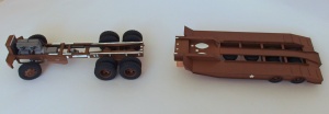 Že se pořád po troškách pracuje, dokumentují tyto relativně malé celky. Na tahači je to korba. Podlahu jsem narýhoval a ještě popřemýšlím o nějakém nákladu. Zadní čelo je projektováno sice oddělené, ale napevno. Neměl jsem ani chuť se pouštět do funkčního otevírání, po dvou třech akcích by se to stejně vinou té barvy urvalo. Horní orámování (díl 203) je o několik milimetrů kratší.