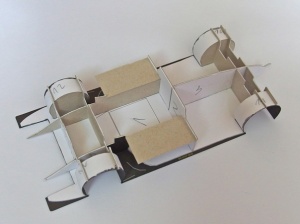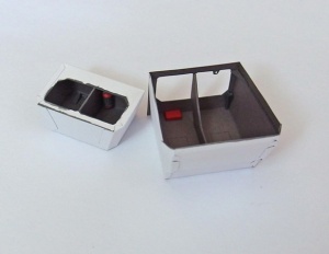 Po hodně dlouhé době pokračuji v lepení. Trošku si opět musím zvykat na konstrukční přístup autora. Kupř. místa pro vyřezání i nalepení jiného dílu na první pohled vypadají stejně. Co se má event. vyřezat se tak dovodí až po studiu návodné kresby. Otvory na bocí pro žaluzie jsem v tomto případě zatím nevyřezal záměrně. Pomohlo mi to udržet správný tvar dílu při lepení sousedních.