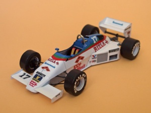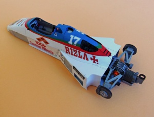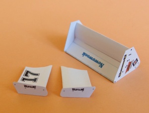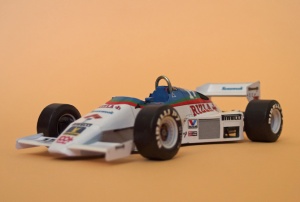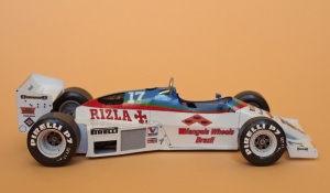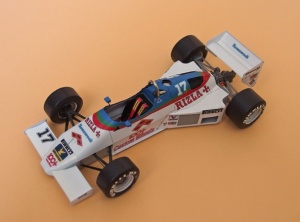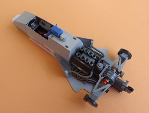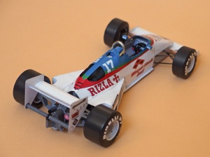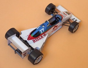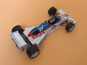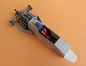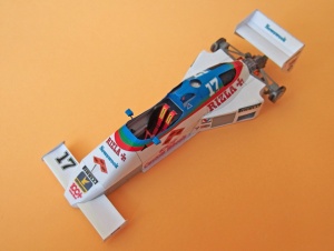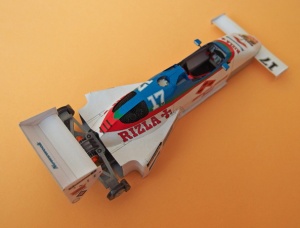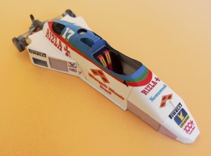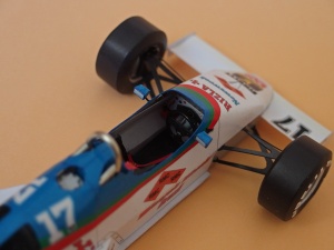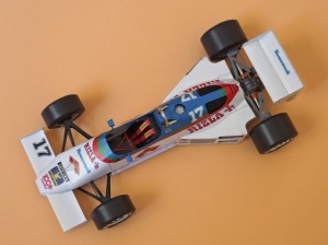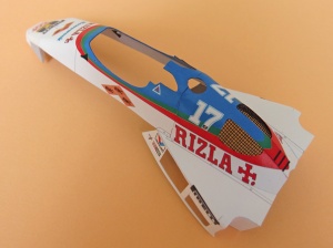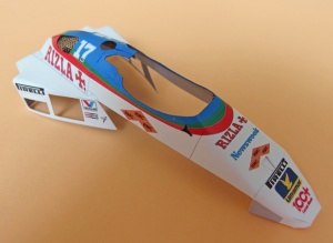Na rozdíl od McLarenu má tenhle kousek pořád naději na dokončení. Chlopeň pro přilepení čumáku je moc dlouhá a její tvar neodpovídá tvaru špice (díl 112). Při lepení na celek jsem odřezal spodní chlopně zadních dílů bočnic (díly 111). Dílu 115 jsem v části před víčkem nádrže musel tak 1 mm na každé straně ubrat.