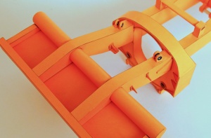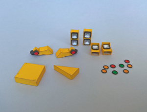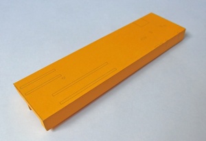 Zádrhelem modelu jsou také "špalky" (díly 1m). Je u nich naznačeno podlepení papírem síly 2,3 mm. Výpalky jsou však silné jen 2 mm, takže pro potřebnou sílu je potřeba ještě zvlášť podlepit vlastní díly z vystřihovánky. Nechápu, proč to zrovna nedělali ze síly cca 2,5 mm, aby se vypálené díly mohly lepit přímo na běhoun (díly 1k a 1l). Právě tyto díly skrývají další zradu, jelikož jsou zrcadlově převrácené, než jak je vzorek nakreslen v návodné kresbě a jak jsou právě díly 1m. Ty by se tak měly lepit potištěným lícem dolů.