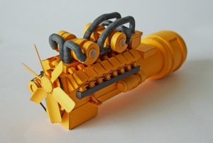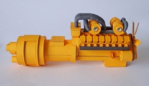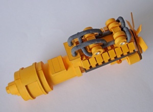 Po nějaké době je více času na modelaření, vrátil jsme se tedy k pohonné soustavě. Papírové potrubí je samo o sobě navržené pěkně, na rozdíl od drátu nebo podobného materiálu se ale nedá při natvarování ohnout a musí se rozřezávat. Složité je tak především natvarování trubek 13, kde autor bohužel nevyužil možnosti lícovat všechny segmenty na rysku spoje. V zápalu boje jsem také dodatečně zjistil, že celek se nevejde do rámu, horní trubky 14 tak budu muset znovu odřezat. Provedení trubek je provizorní, ještě by mělo přijít na řadu ohlazení příp. konečné nabarvení.