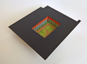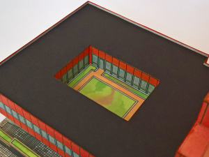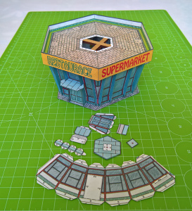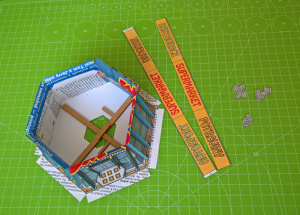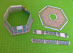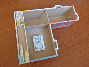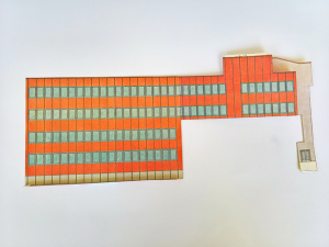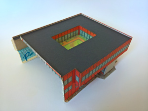 Šablonu střechy jsem pro zpevnění podlepil kartonem a navrch přišel silnější barevný papír. Hrana je tak dost silná, abych mezi stěny mohl lepit bez chlopní. Rozměr střechy jsem musel upravit - na hraně naproti výškové budově jsem odřezal pásek cca 1 mm široký. Na nadezdívky jsem využil plochy ze stránky, kterou jsem měl navíc.