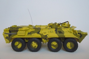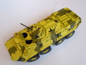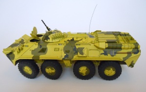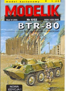 Model byl vydán v roce 2002, ale již v té době se jednalo o reedici (nova edicja). Dlužno podotknout, že původní kamufláž, byť také "modelikovská", byla podle mě určitě atraktivnější. BTR-80 patřil mezi první polské modely, které jsem si před lety koupil a k tomu si neodpustím malé rýpnutí: Hlavním impulsem pro nákup tehdy byl "Návod v češtině" inzerovaný na internetových stránkách jistého českého prodejce; návod však nebyl, přes opakovaná ujišťování, nikdy dodán. Přitom i v aktuální nabídce na internetu je návod v češtině stále zdůrazňován. Jojo, asi taky způsob jak zajistit vyšší prodejnost méně atraktivního zboží. Buď jak buď, ani s originálním návodem v polštině se autoři moc nevyznamenali, podrobně je totiž popsáno pouze sestavení kol a jejich zavěšení.