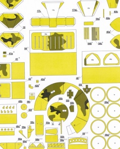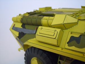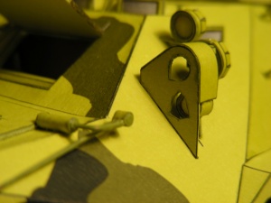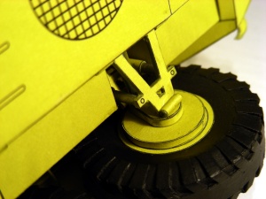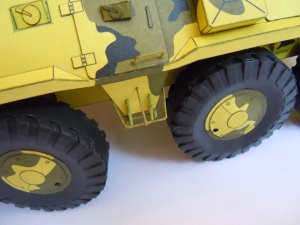 Ještě bych se mohl v krátkosti zmínit o závěsech kol. Po prvotním (a musím se přiznat že i povrchním) přečtení návodu jsem myslel, že kola předních dvou náprav jsou řiditelná, v čemž mě utvrdilo i pár fotek z netu. Při stavbě jsem však zjistil, že realita je jiná. Řízení je zpracováno tak, že kola lze zalepit vytočená na jednu nebo druhou stranu, ale napevno. Byť funkční řízení by nebylo zas až takový problém (úpravy stávajícího by nebyly složité), ale v této fázi stavby jsem nepřišel na to, jak spojit všechna 4 kola, aby se zatáčela stejně, a hlavně jak toto zařízení nacpat do již kompletně slepené korby. Prořezat by se musela nejen korba, ale i 1 mm kostry na každé straně a navíc i díl kostry vedený středem vozidla. Takže nakonec jsem kola zalepil napevno (jak to ostatně zmiňoval návod). Pokud tedy někdo budete chtít kola řiditelná, myslete na to již od začátku stavby.